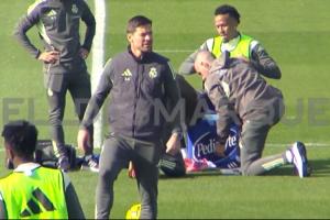 体育资讯11月08日讯 西媒ElDesmarque放出了皇马训练的视频,米利唐受伤坐在水箱上,队医为他缠上绷带。阿隆索代替他上场完成了团队训练。