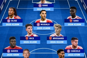阿森纳+拜仁历史身价最高阵容:凯恩、穆西亚拉、赖斯、萨卡在列