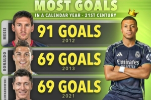 体育资讯12月1日讯 数据网站Score90盘点了21世纪以来单一自然年进球榜,其中梅西91球高居榜首,姆巴佩今年60球第6,具体如下:
