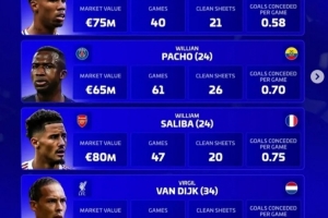 加布里埃尔(阿森纳,27岁,巴西):身价7500万欧,40场,21零封,场均丢0.58球