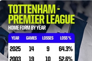 热刺此前只在1994年、2003年主场输球场次达到10场,而今年他们还有4场英超主场比赛。