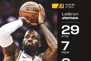 本场比赛,湖人前锋詹姆斯上场34分钟,17投12中得到29分7篮板6助攻。