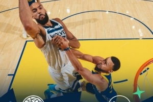 赛后森林狼发布赢球海报,封面人物为戈贝尔,背景则是在内线防守他的库里。