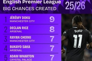 本赛季英超创造重大机会榜: