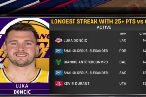 现存球员VS球队连续25+纪录排名:
