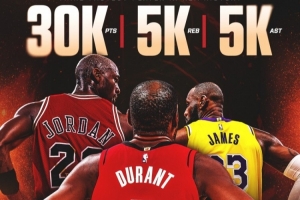 火箭官方也晒图致敬杜兰特这一伟大时刻,他们写道:“又一项历史被创造 🏆杜兰特成为NBA 历史上第3快达成 30000+ 得分、5000+ 篮板、5000+ 助攻的球员。”