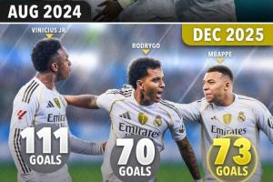 2024年8月,姆巴佩收获皇马处子球时,罗德里戈已经代表皇马取得54粒进球,维尼修斯已经打进84球。一个半赛季过后,姆巴佩已经代表皇马83场比赛打进73球,超越了罗德里戈的70球,与111球的维尼修斯的距离也大幅缩小。