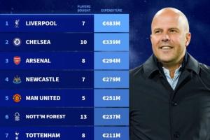 英超霸榜!本赛季引援花费:利物浦4.83亿欧领跑 蓝军第2 枪手第3