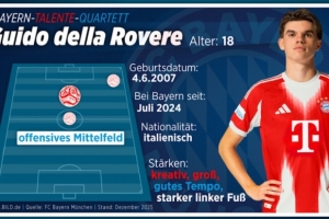 圭多·德拉罗韦雷,这位18岁的攻击型中场身材高大却技术细腻,被誉为“拥有细腻的左脚技术”。作为拜仁U23主力,他在地区联赛中交出了4球9助攻的数据,身价在一年半内增长了六倍。