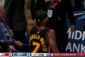 体育资讯12月30日讯 在今天老鹰129-140不敌雷霆的比赛中,亚历山大-沃克命中了一记神奇的半场左手压哨三分。