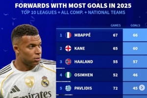 体育资讯1月4日讯 《转会市场》统计了2025年前十联赛前锋的俱乐部+国家队各项赛事进球最多情况,姆巴佩居首。