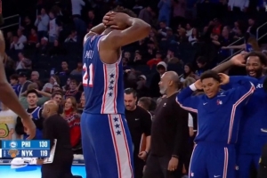 GIF-76人在麦迪逊击败尼克斯 恩比德跳舞庆祝&洛瑞和庄神模仿