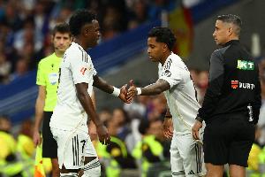 皇马首发:库尔图瓦;A费、吕迪格、阿森西奥、巴尔韦德;琼阿梅尼、卡马文加、居莱尔、贝林厄姆;维尼修斯、罗德里戈