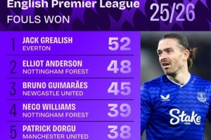 本赛季英超造犯规榜:格拉利什居首,多尔古、萨卡、佩德罗在列