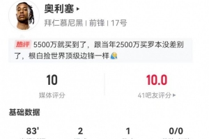 体育资讯1月12日讯 拜仁在本轮德甲7-1领先狼堡,奥利塞本场数据如下: