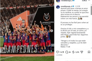 体育资讯1月13日讯 巴萨后卫阿劳霍更新社媒动态,谈到了复出并随队赢得西超杯的感受。