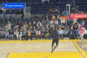 赛前,勇士球星库里进行赛前热身,背身抛球助跑勉扣可惜未能成功。