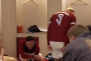 比赛结束之后,哈兰德与队友在更衣室内载歌载舞庆祝,现场氛围十分热烈。