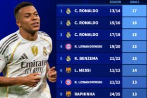 而在欧冠单赛季进球排行榜上,姆巴佩距离C罗在2013/14赛季的17球纪录还有6球之差。