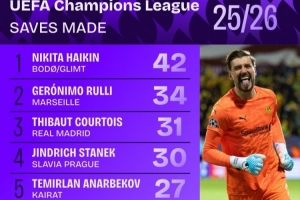 体育资讯1月23日讯 数据机构Squawka统计本赛季欧冠门将扑救次数,博德闪耀门将尼基塔·哈伊金以42次居首。