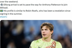 报道称将为这位22岁的年轻门将支付300万英镑转会费。埃勒伯格今日将前往桑德兰,并将在周末接受体检。他的加盟预计将为桑德兰门将安东尼·帕特森转会米尔沃尔铺平道路。球员风格与罗宾·罗夫斯相似,后者自夏季加盟以来一直给人留下深刻印象。